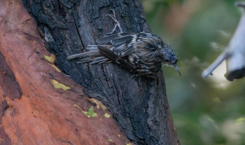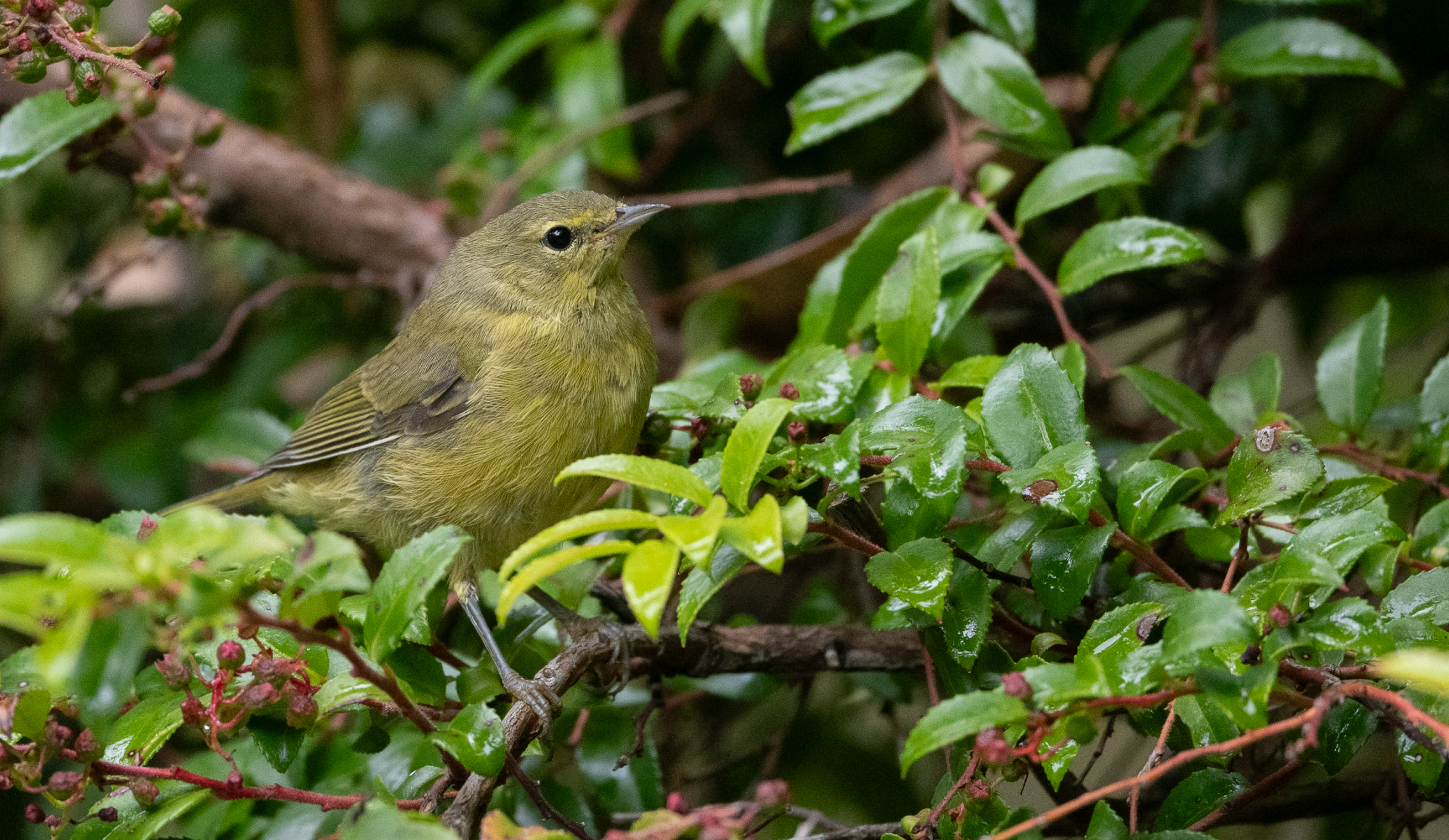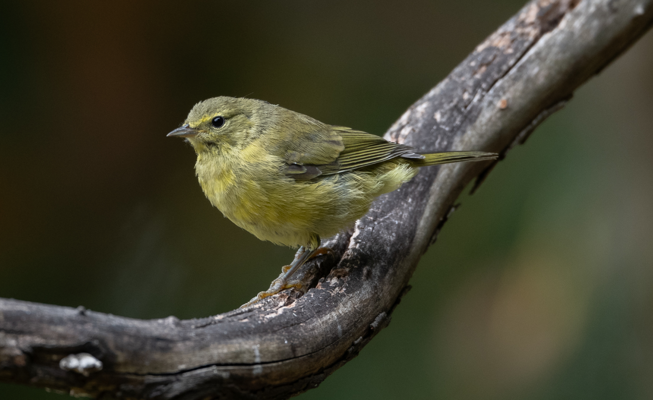 The next bird of special interest was an Orange-crowned warbler, the first warbler species I’ve seen since early June. The warbler spent significant time exploring the yard and giving me many opportunities for photographs.