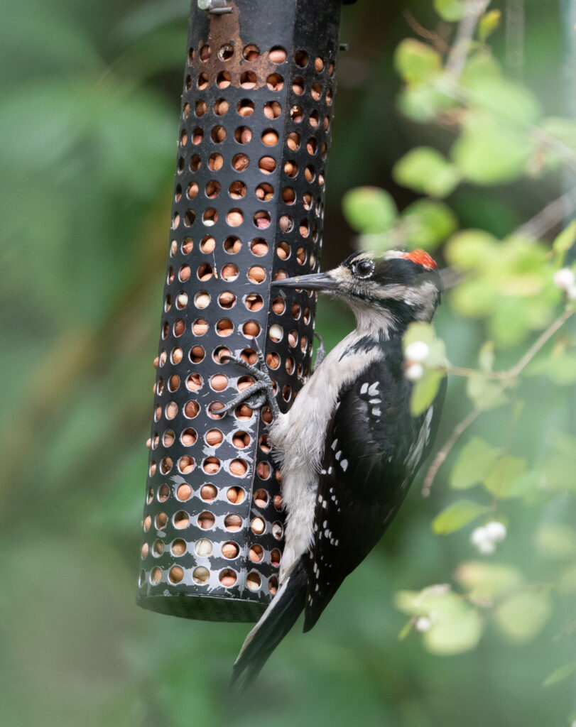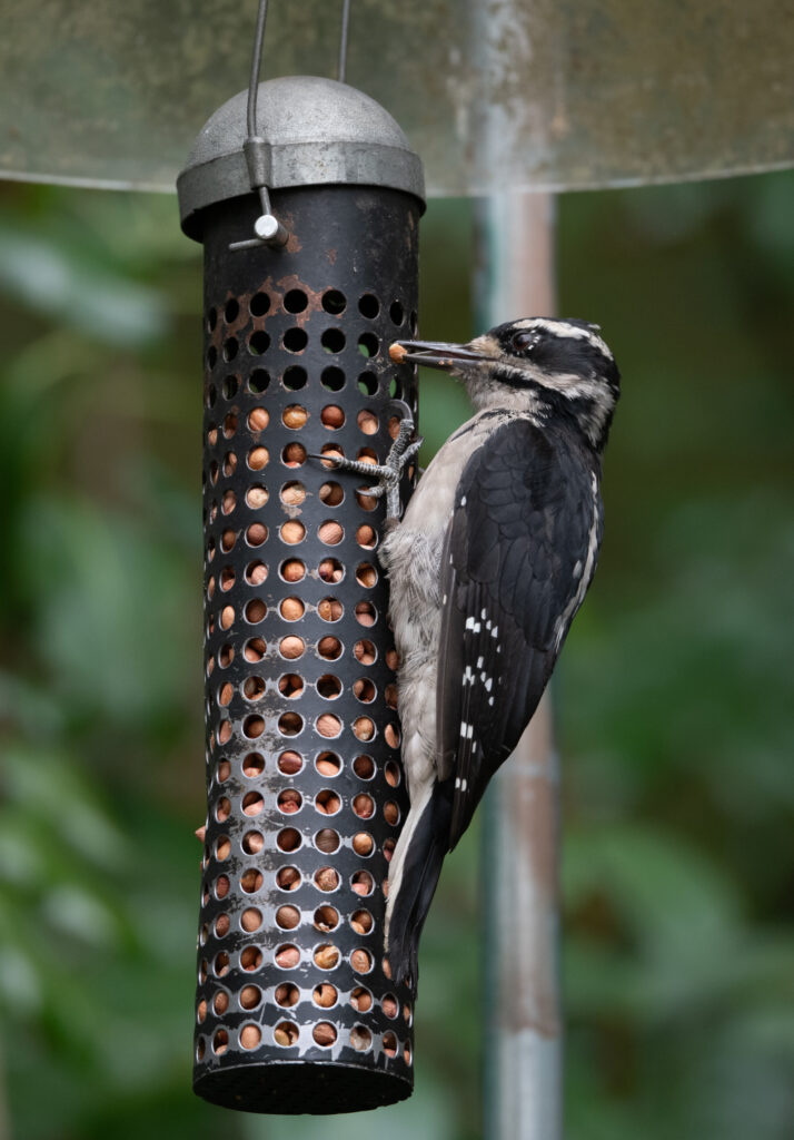 So it’s finally time to arrive at some photos!  The male Hairy woodpecker was photographed on August 17 and I haven’t seen it since. The female has now become a daily visitor to the peanut and suet feeders and the photos of her were all taken on August 31.  To help with identification I measured the peanut feeder. It is 8.5” from the bottom of the feeder to the top of the top row of holes.