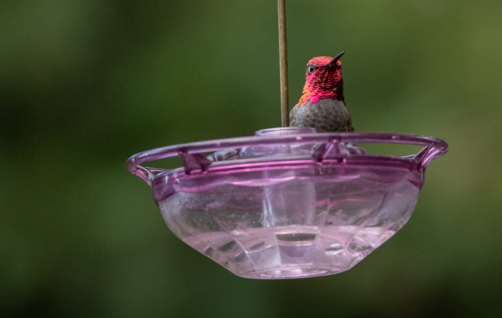 and male Anna’s hummingbirds at a feeder. They are year-round residents of the area.