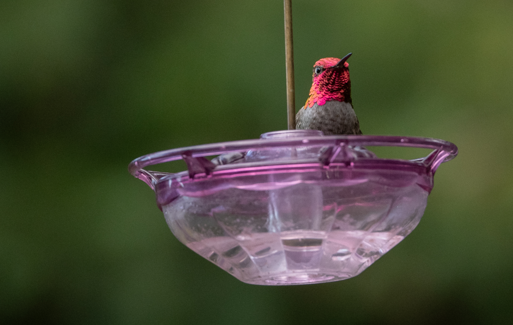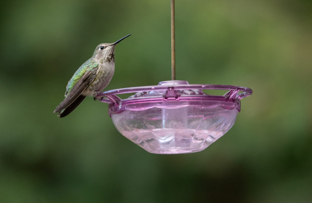 I had to wait much longer for a third visit, but on this visit the hummingbird visited a feeder far enough away to provide me with an opportunity for photographs. The bird lingered on the feeder for a considerable time, but never gave me a good opportunity for photographs that didn’t include the feeder. As is true for all birding photography, I had to take the opportunity that was given to me.