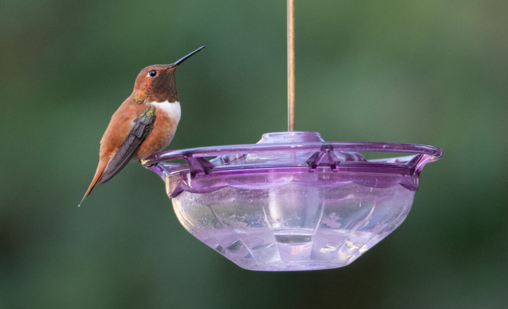 About 20 minutes later I had another sighting. This time a male Rufous hummingbird came to a feeder that was only about five feet from me, too close for photos. When I made a slight movement with my camera it quickly left the yard.