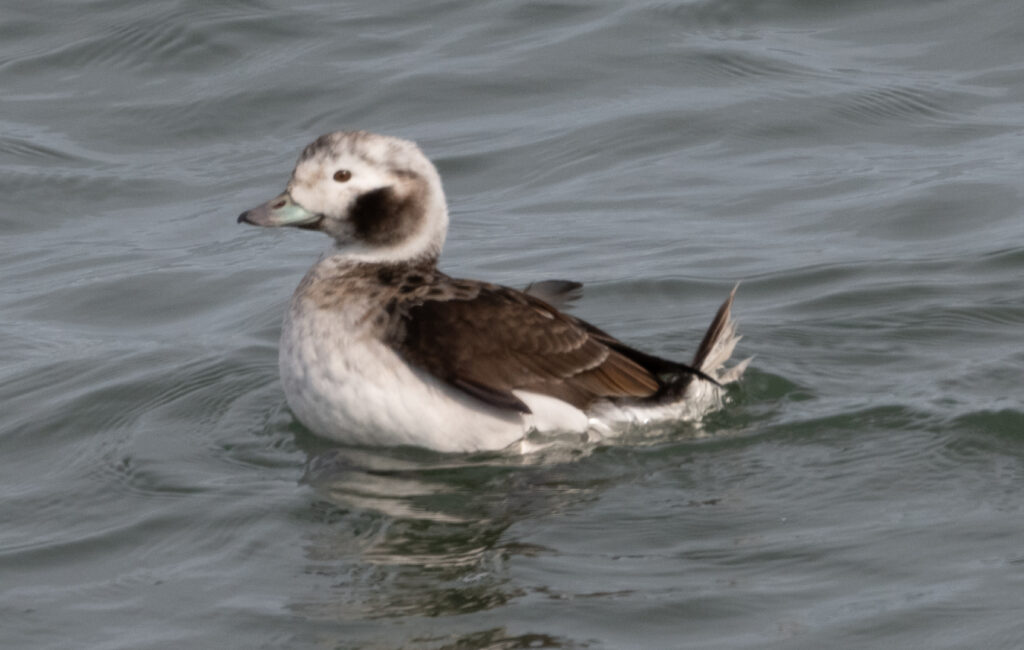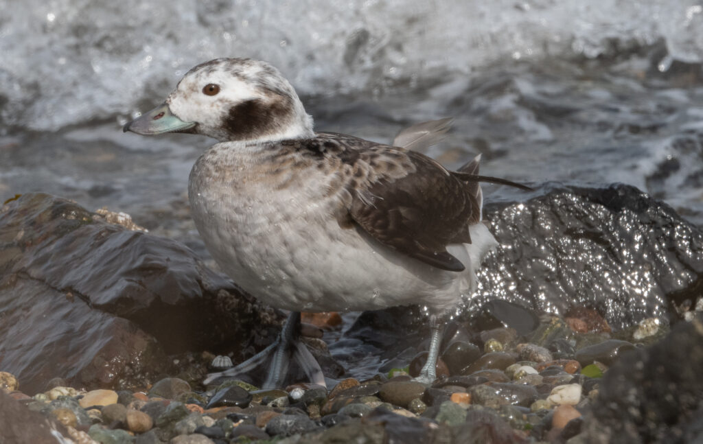 On my way back around the point, I saw a duck land on the water in the distance, and it didn’t appear to be one of the more common waterfowl that I’ve been seeing over the last couple of weeks. I stopped my vehicle and watched as it swam parallel to the beach towards me, but at a considerable distance offshore. When it got even with me, it made a right angle turn and came straight towards me, finally walking up on the beach right below me and settling among the rocks! At the time, I wasn’t sure what it was, but in processing my photographs and consulting with a friend I’ve come to the conclusion that it was a female Long-tailed duck. I think I’ve only photographed one other in the 25 years I’ve lived here.
