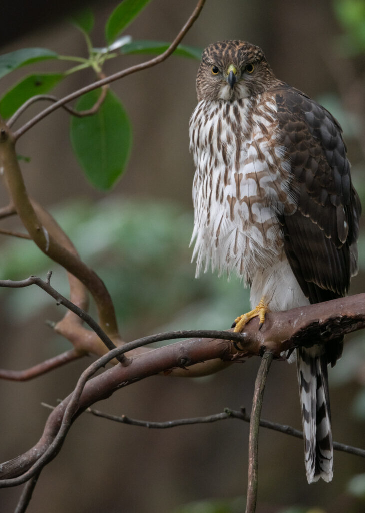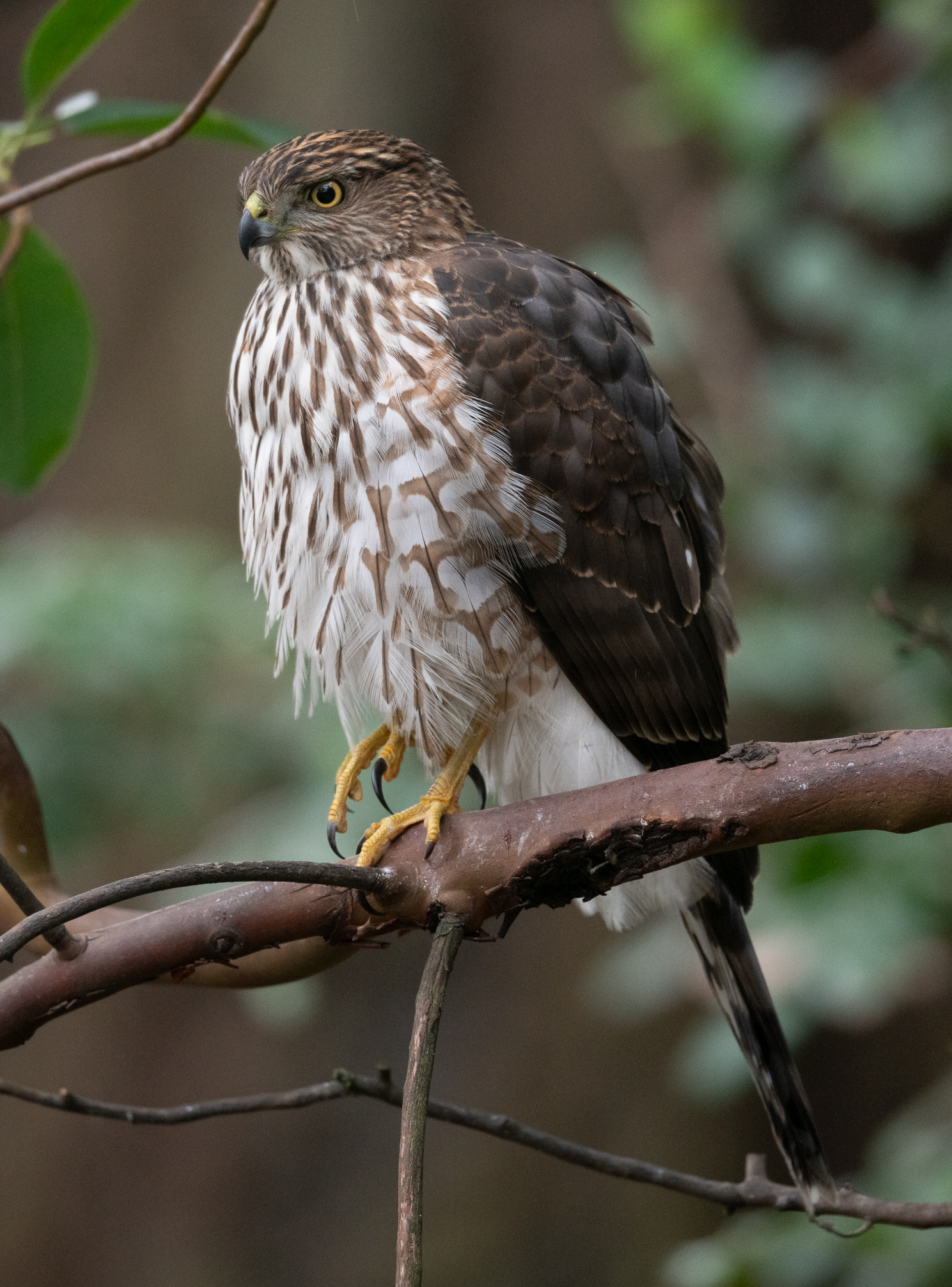 After I’d been sitting for a while, all the birds suddenly disappeared, which usually happens when an accipiter enters the yard. I sat very still and looked around but didn’t see any sign of anything that would frighten the birds. A slight movement under a bush caught my attention… it was a female Dark-eyed (Oregon) junco sitting very still, again indicating the presence of an accipiter. A few minutes later, a juvenile Cooper’s hawk suddenly flew down and landed just above my stone birdbath and perched in open view about 25 or 30 feet away! It remained long enough for me to tire of taking photographs (!) before it finally left the yard.